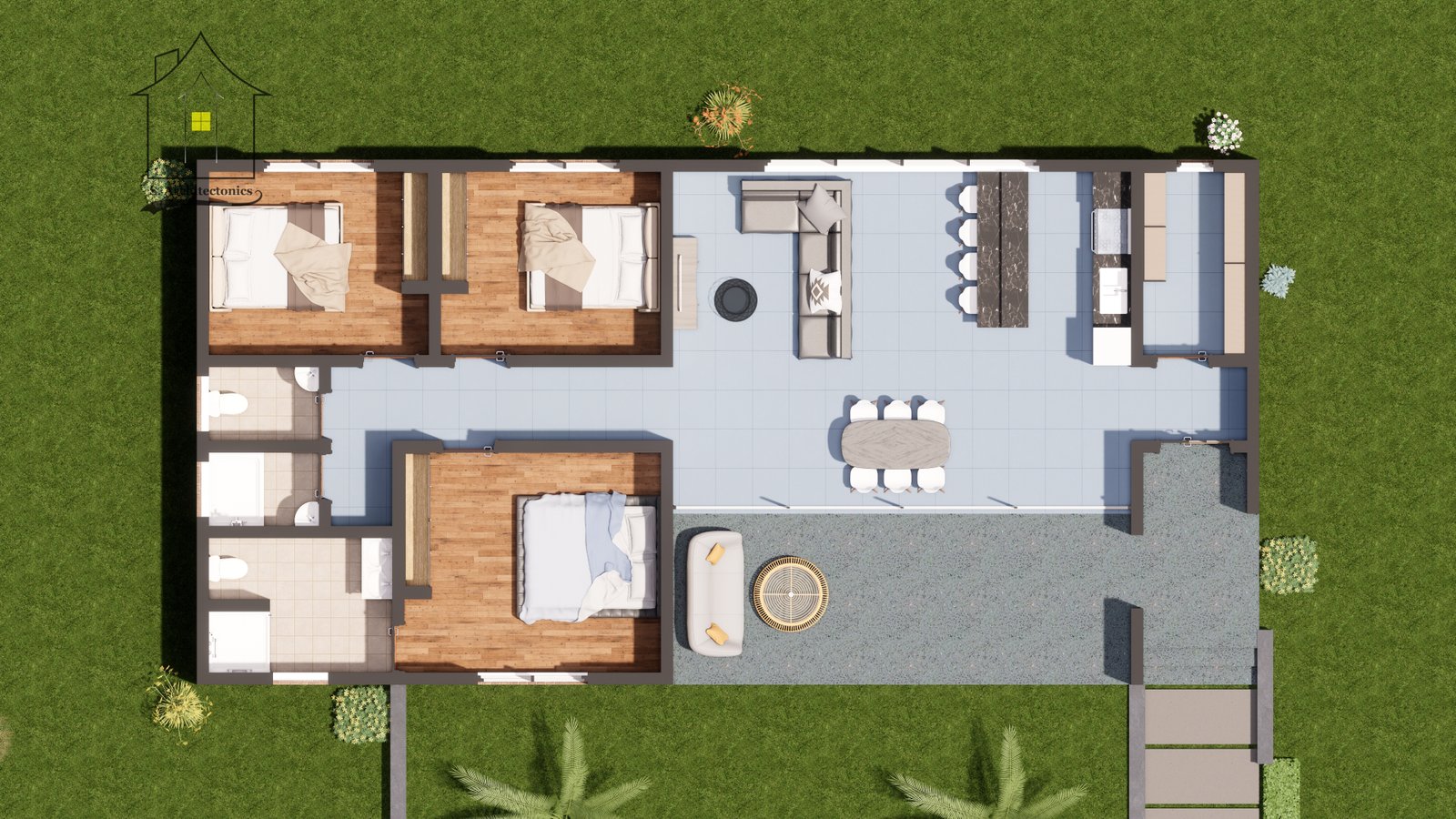A graceful three-bedroom design spanning a total plinth area of 148 square meters. The entrance porch leads to a charming patio, setting the tone for the inviting interior. The open-plan living area, comprising a lounge, kitchen, and dining space, is designed to maximize natural light, creating a bright and airy atmosphere. Two well-appointed bedrooms share a separate WC and shower room, while the cozy primary bedroom is ensuite for added privacy and luxury. The layout seamlessly combines functionality with a touch of sophistication, perfect for modern living.