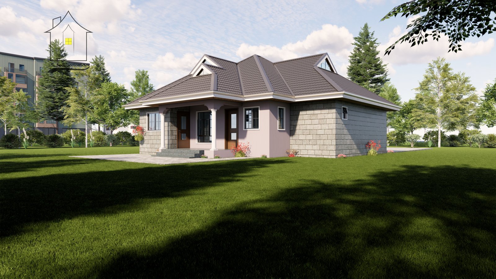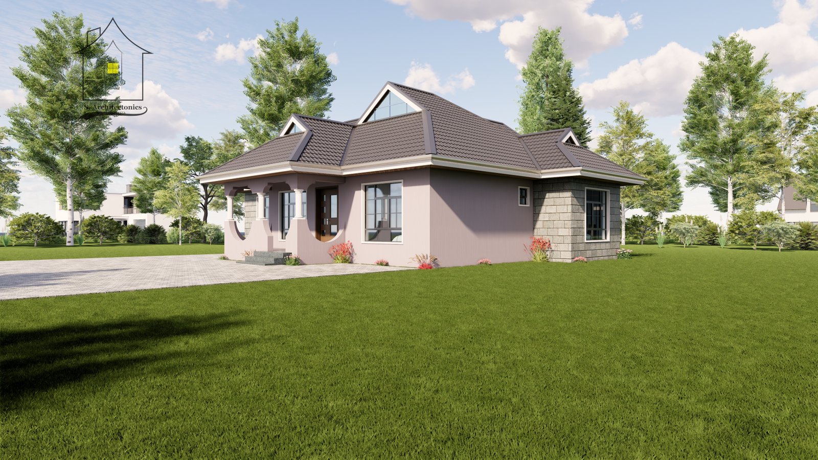 This charming three-bedroom bungalow boasts a a total plinth area of 143 square meters (14.2 x 13.6 meters).