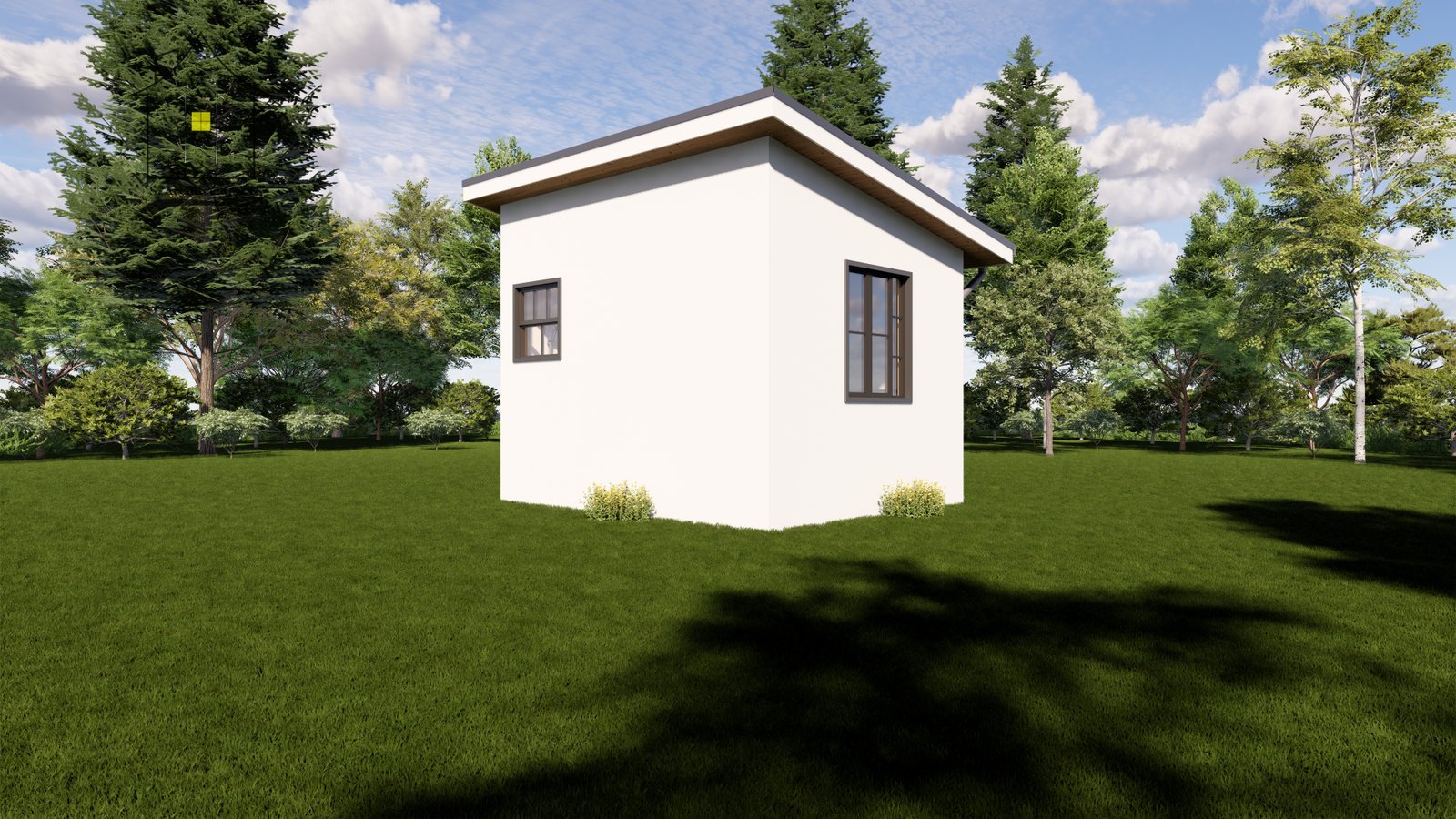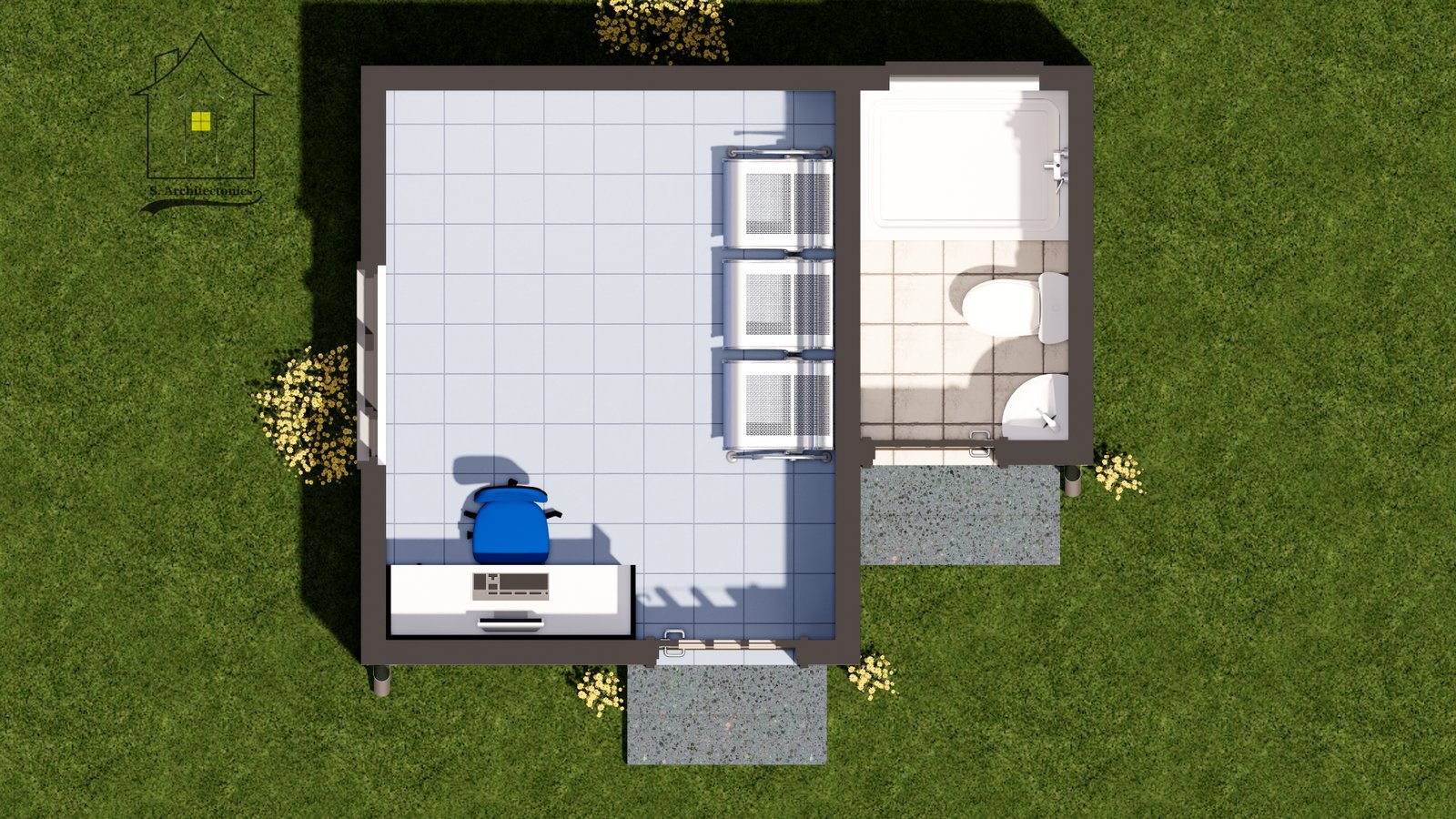 This guard house design features an open office space combined with a waiting area, and a washroom, providing a functional and compact security facility.