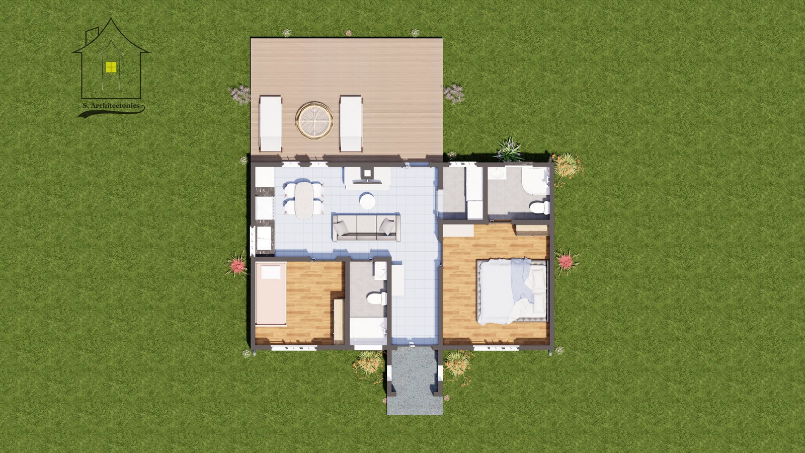 This two bedroom house design has a plinth area of 62 meters (12.15 x 9.8 meters).