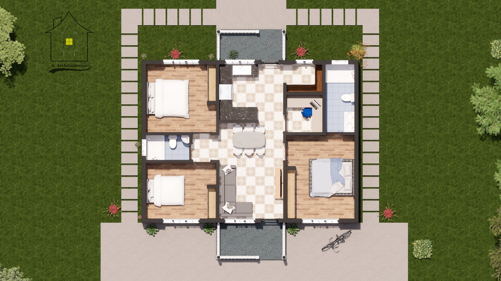 A simple & charming 3-bedroom design. Plinth area = 94 sq. meters (11.2 x 10.5 meters). The house features: