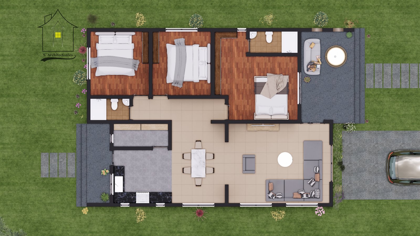 This is a simple three bedroom bungalow house design. Total Plinth Area = 147 sq. metres (16.3 x 10.1 metres).