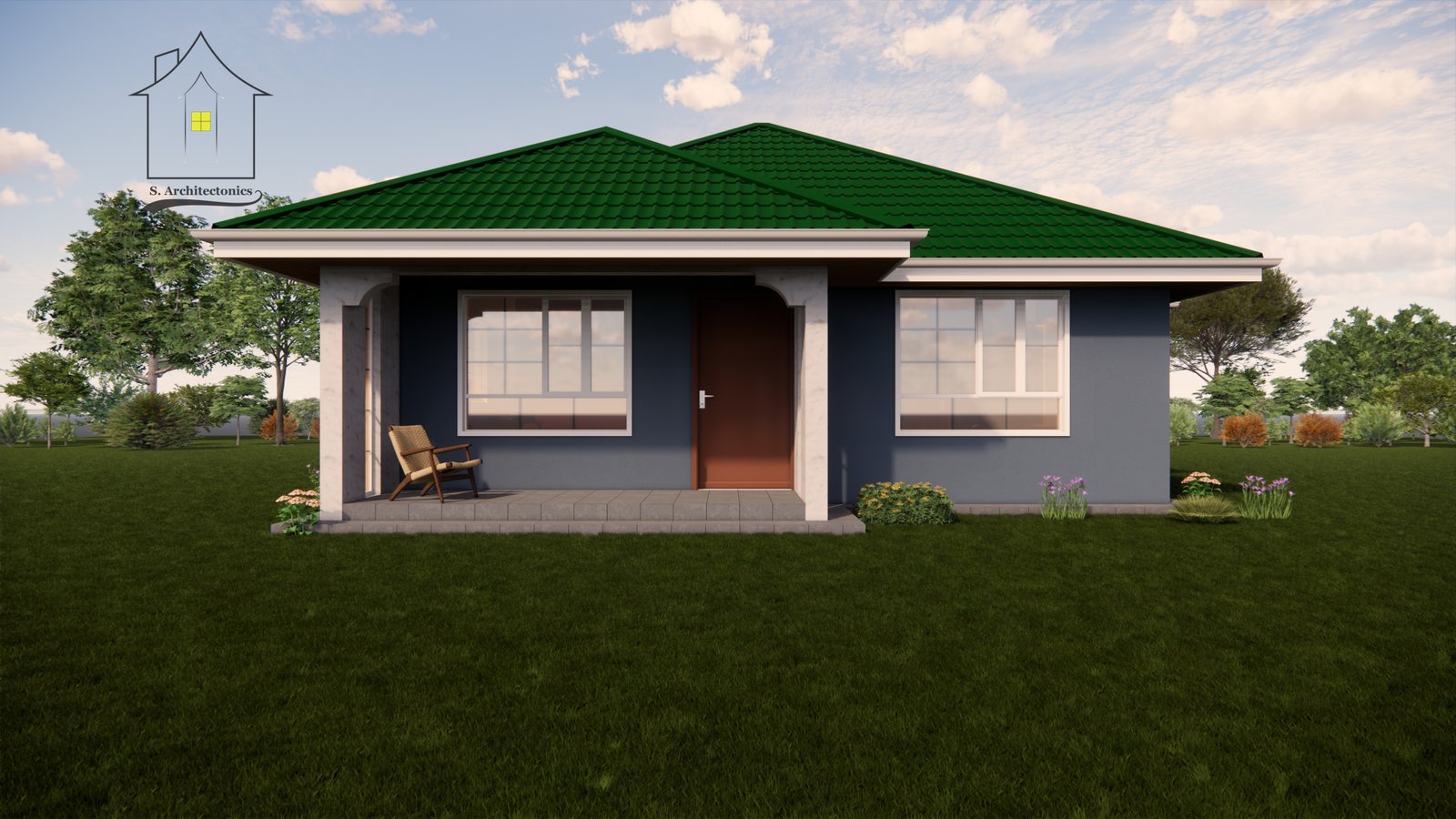 A simple two bedroom bungalow with a plinth area of 84 sq. meters (10.7 x 9.2 meters).