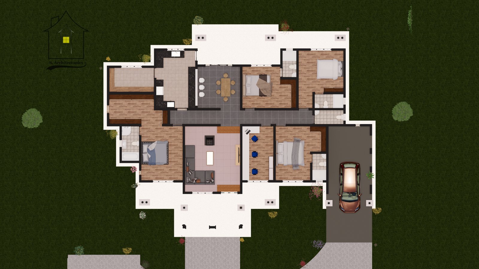 A splendid four-bedroom bungalow house plan. Plinth Area = 298 sq. meters (23.1 x 18 meters).
