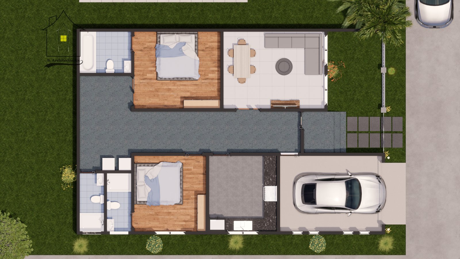 This stunning two-bedroom house design spans 133 square meters (15 x 10 meters). It features a welcoming front porch, a spacious lounge combined with a dining area, a well-appointed kitchen, and a central lobby. Both bedrooms are ensuite for added privacy, complemented by a common washroom and a dedicated car park for one vehicle.
