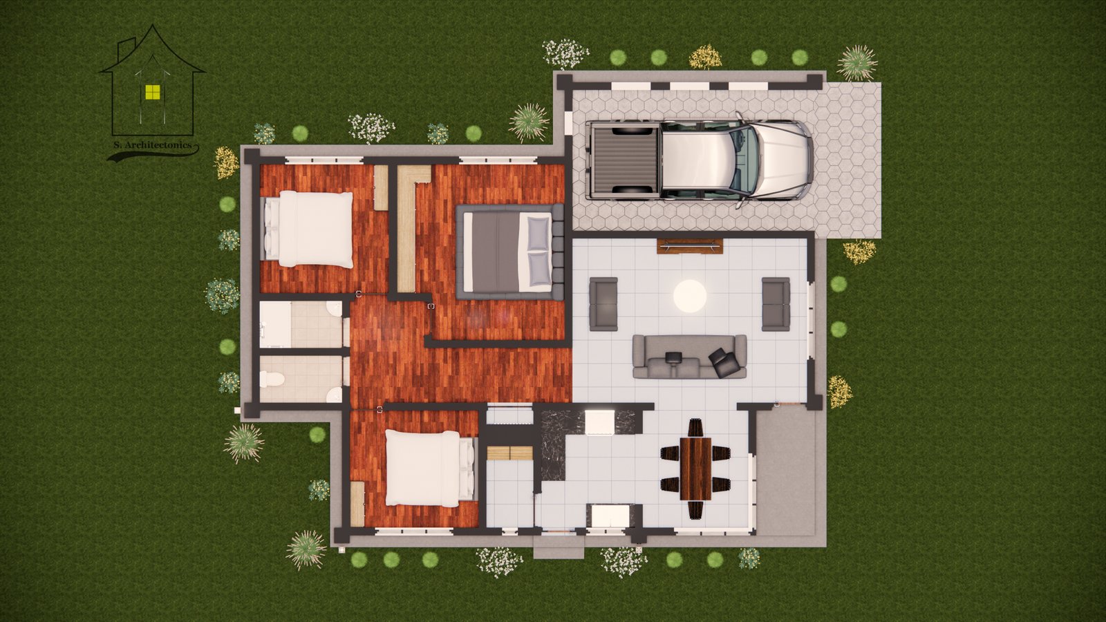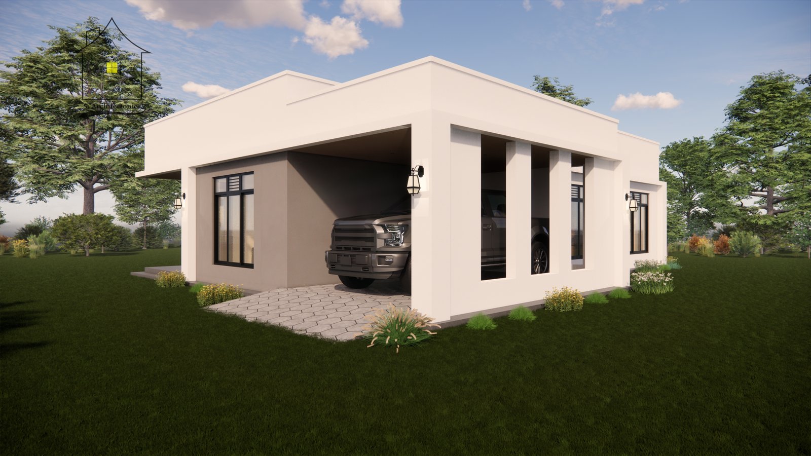 A stylish three bedroom bungalow with a hidden shed roof. Total Plinth Area = 107 Sq. Meters (14.8 x 12 meters).