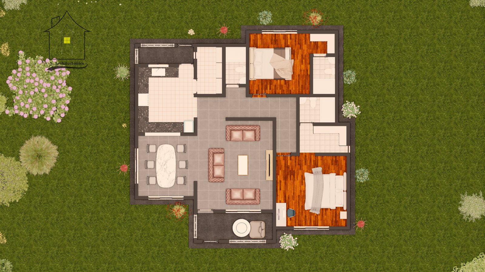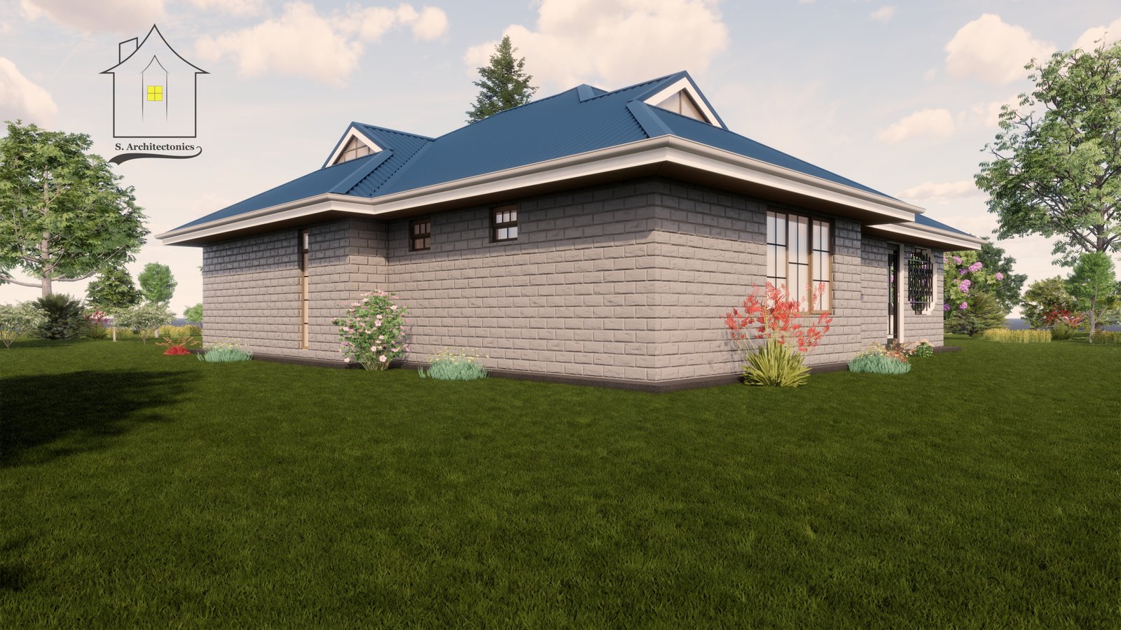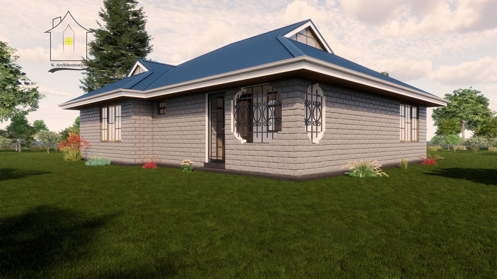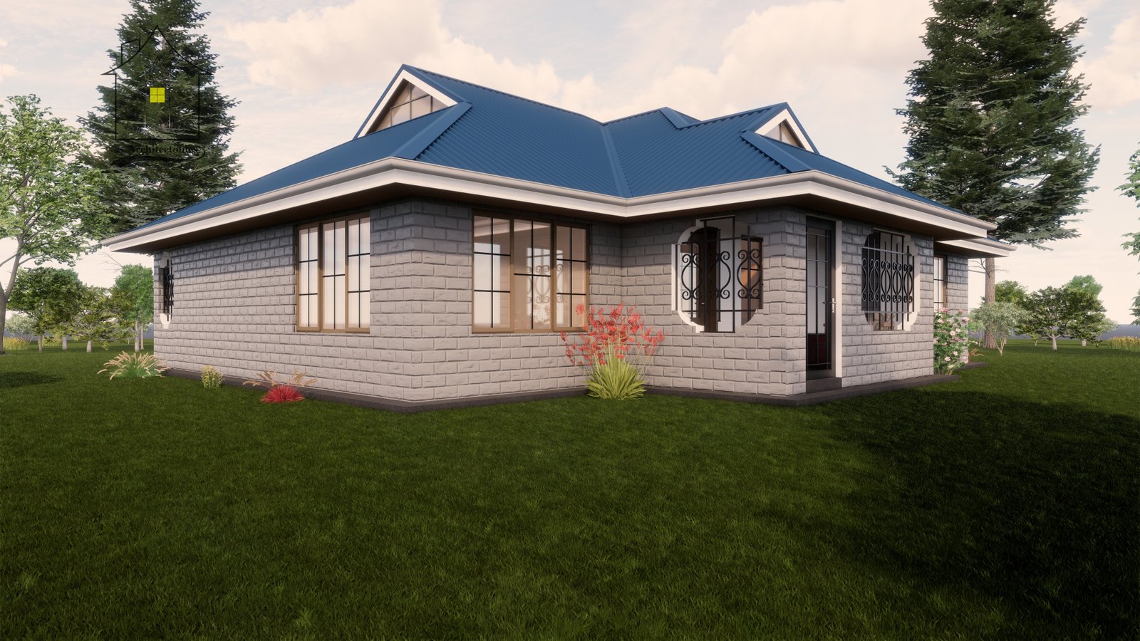 A two bedroom bungalow with a plinth area of 140 square meters (12.8 x 12.5 meters).