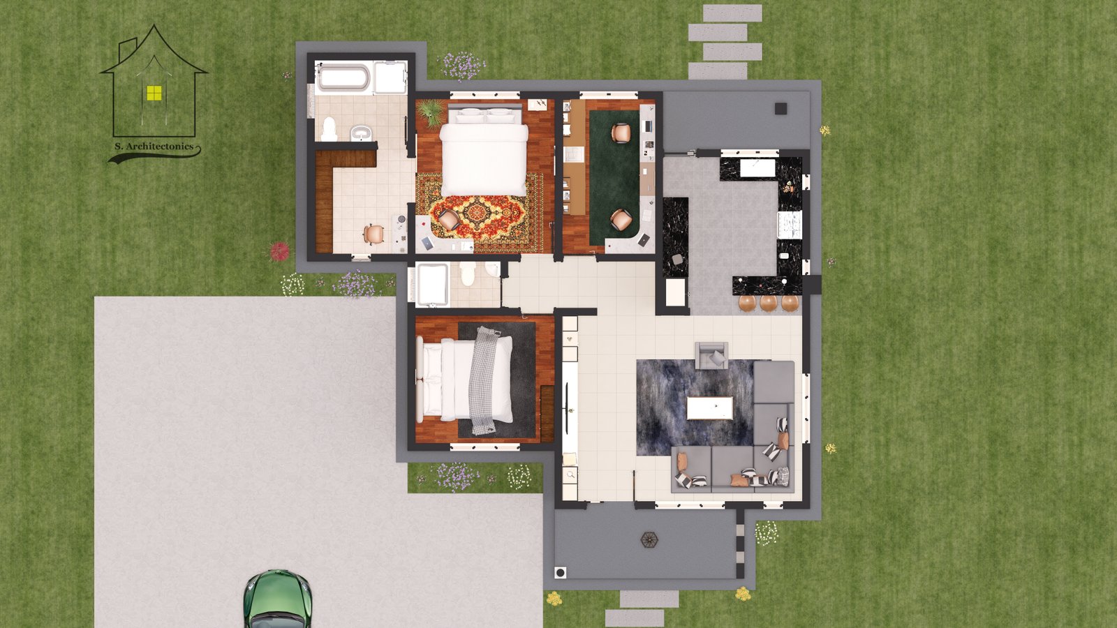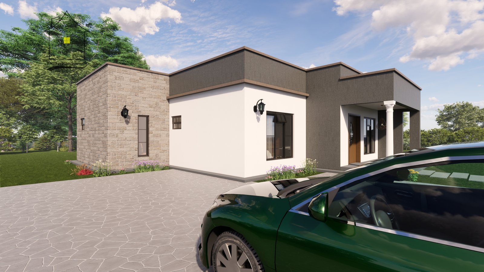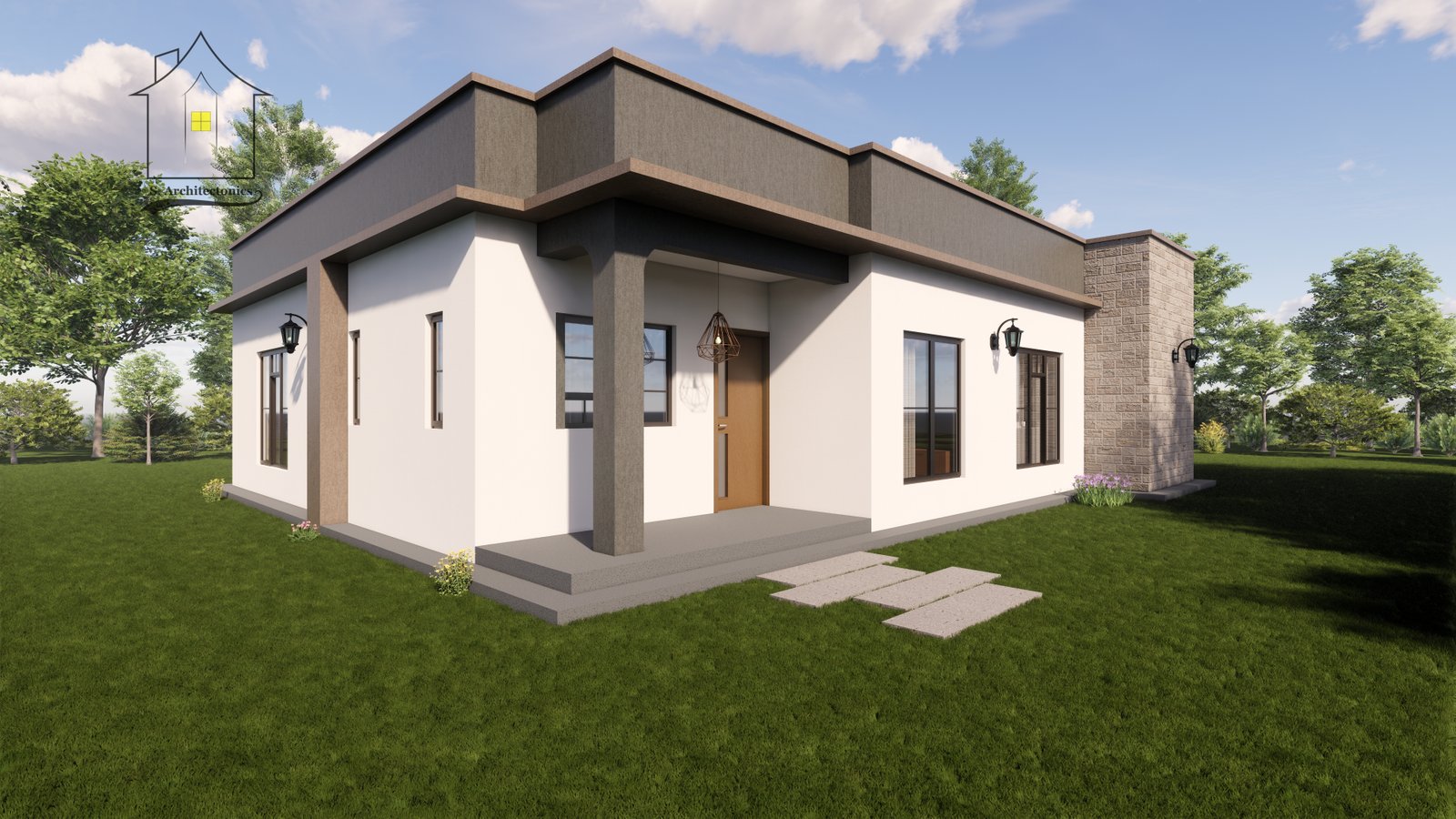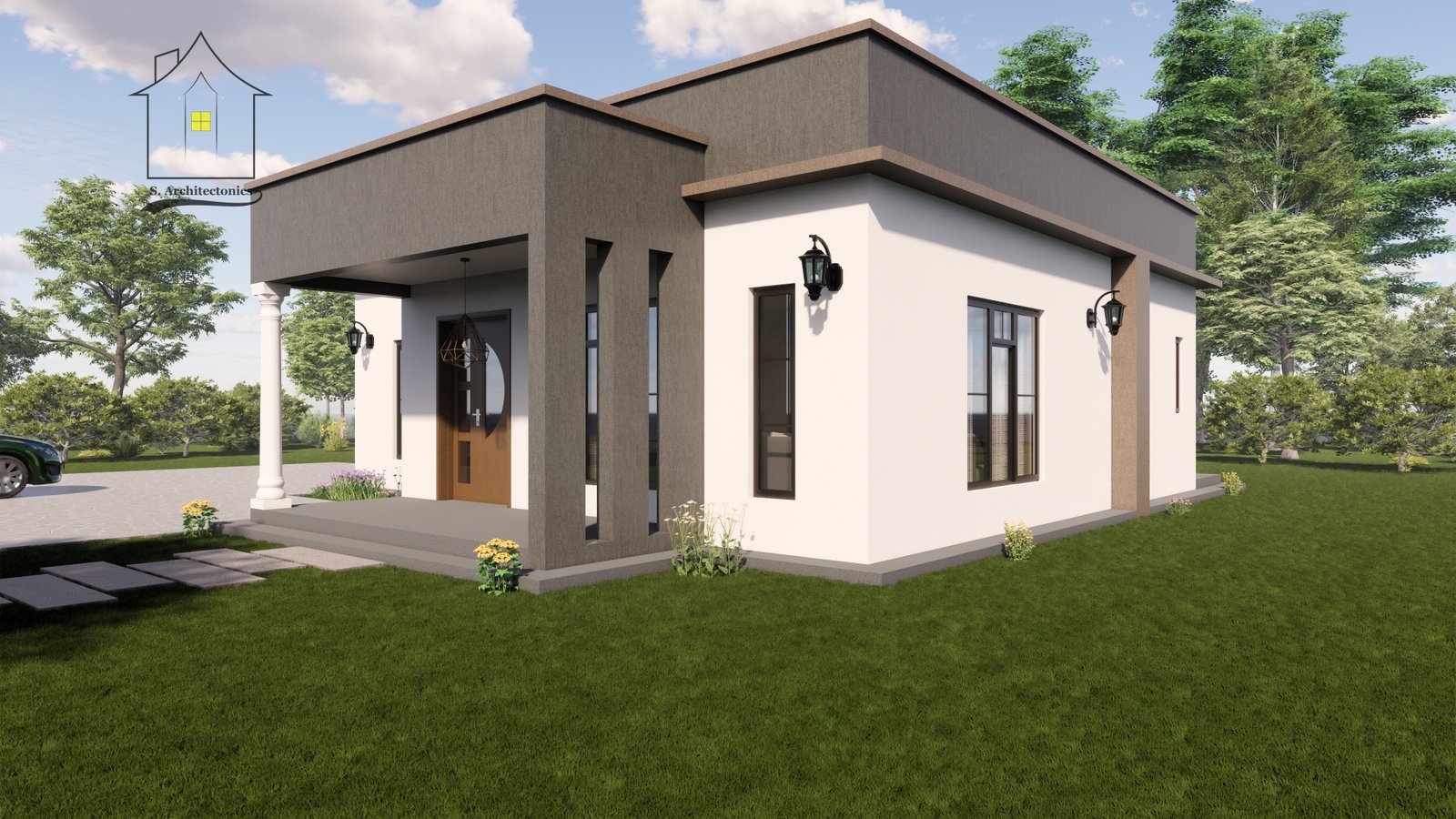 This elegant two-bedroom bungalow boasts a total plinth area of 130 square meters (13.6 x 13.3 meters), offering a harmonious blend of functionality and style.
